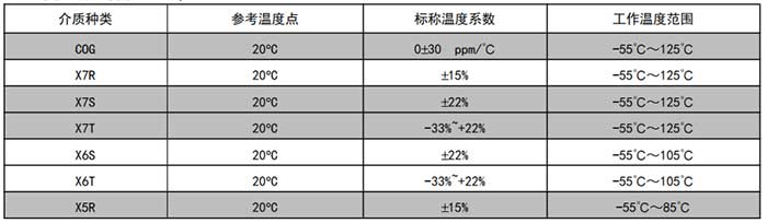 | 介质材料 | COG | X5R | X7R | X7S | X7T | X6S | X6T |